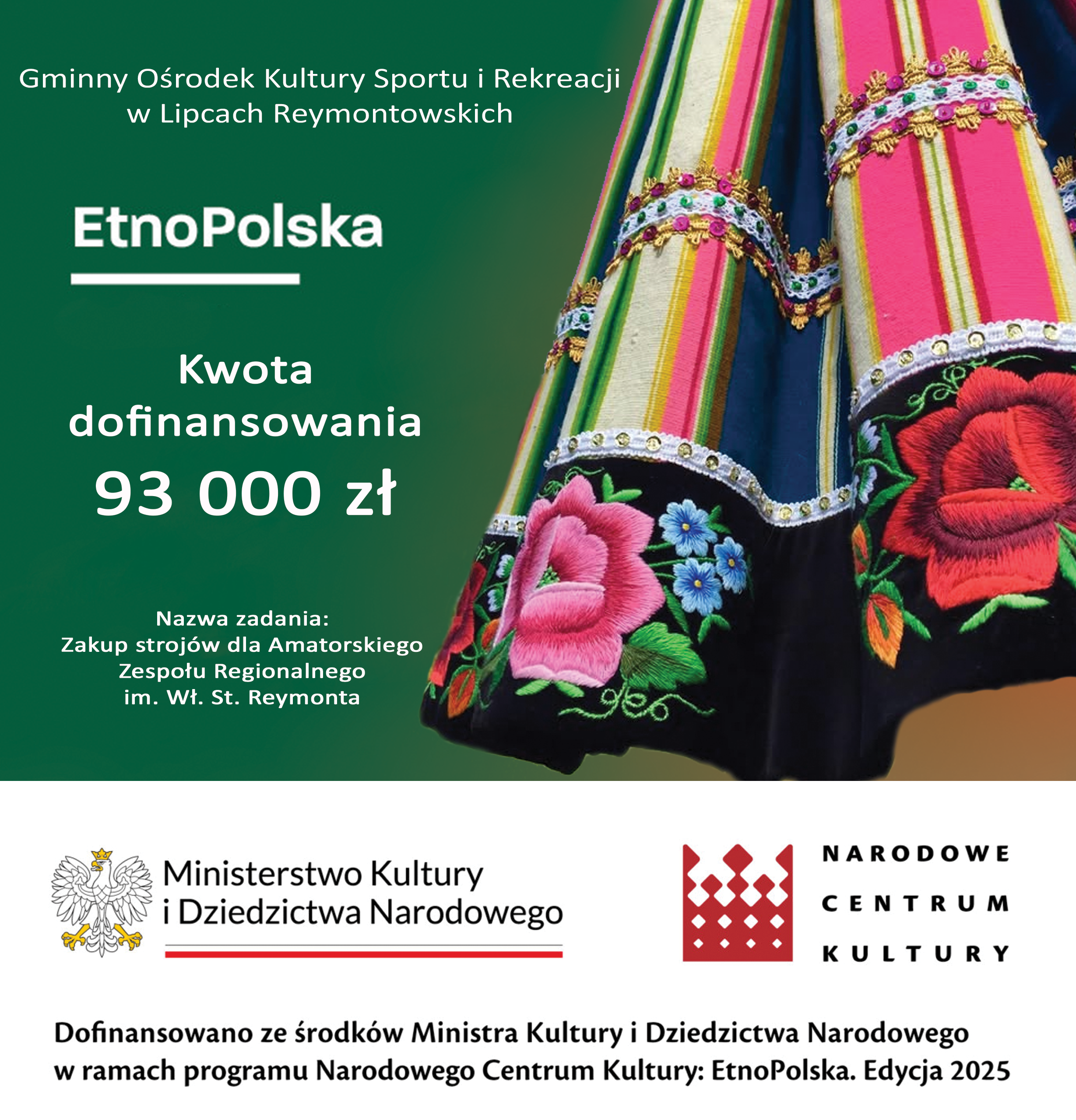 Na realizację projektu „Zakup strojów dla Amatorskiego Zespołu Regionalnego im. Wł. St. Reymonta” przeznaczono 99 800 zł, z czego 93 000 zł stanowi dofinansowanie pochodzące ze środków finansowych Narodowego Centrum Kultury. Środki te są przeznaczone na przygotowanie kompletnych strojów ludowych, które nie tylko uatrakcyjnią występy, lecz także pozwolą młodszym pokoleniom zobaczyć bogactwo i różnorodność barw, wzorów oraz krojów związanych z kulturą regionu.